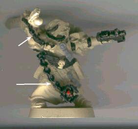 I then added a chaos marauder's flail chain with a crux terminatus taken from the banner pole of a plastic terminator.(arrow) My intention was to give some indication of movement as the Champion whirled around in battle.(figure 8) |