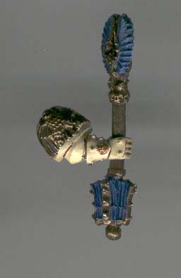 Now the stage was set for the chaplain to come together. I had already positioned pins in the body to support the ams. I again spent a bit of time getting the model standing upright, and positioning the arms so that they were just right. The chaplain would be charging with the bolt pistol in his left hand pointing at the enemy while wielding the crozius in his right hand, ready to swing. The left arm was carefully positioned so that the bolt pistol was lined up along his eye level.
