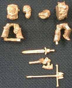 These are the bits I will use: I start with Logan Grimnar, all hacked up. His legs and his right arm will be used. The Chaplains left arm will be used. I cut the hand off so I can fit the Terminator Captain's sword there. I will also use his upper body. The axe is from the Chaos Lord which I converted into a Wolf Lord for my brother and he wanted twin Lightning Claws. It will be held in the right hand. The Banner pole is from a Death Wing Terminator Sergeant. |