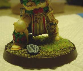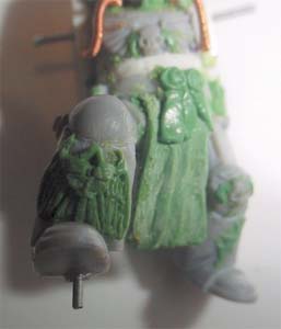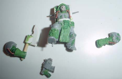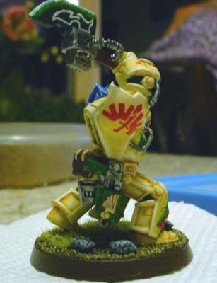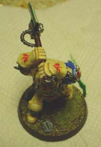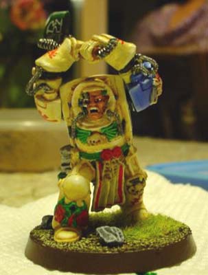 The face: I left the eye white, dark flesh over rest of fleshed part of face, then a mixture of dark flesh and bronzed flesh mix working up to pure bronzed flesh with a final highlight of elf flesh and bronzed flesh mix. The bionic side of face was painted with Boltgun metal, then a black ink wash followed by highlights of mithril silver. |