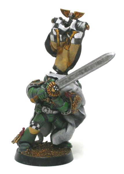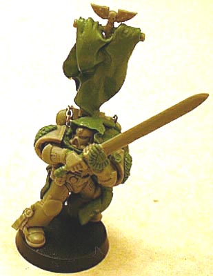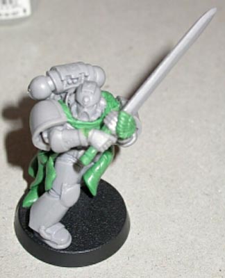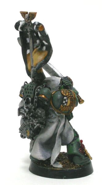 To add additional flavor (and to allow my character to shoot at all) I've added a bolter attached with chains to the backpack. (good advise, if you are married, ask before you cut your wife's necklace) The best source of chains should be cheap fake jevelry. Glue it with super glue, hiding the ends under the backpack. Using the same technique we used for robes to sculpt your banner and we are done with the modeling.