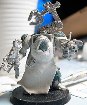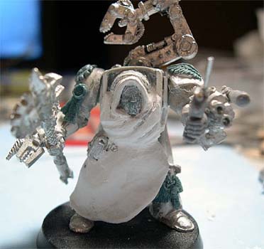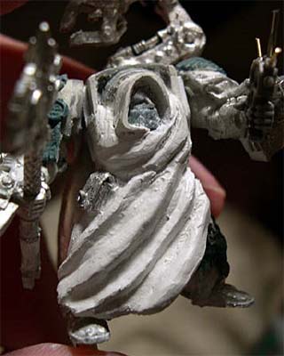 I cut out a pattern and placed it on the Terminator. Once again, don't worry about excess milliputt, just get the shape that you want. I usually let the milliput dry a little so it reatains the shape of the robe a little better