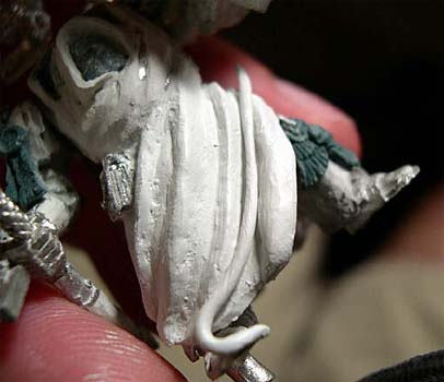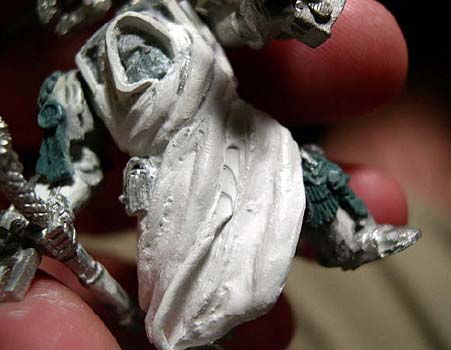 milliput to fill in between each fold. This helps them blend together, so that it actually like folds in cloth. You want this to then dry over night and the use the extra fine sand paper to sand the robe smooth.