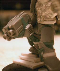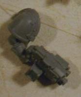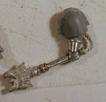 To start off, the model's legs were completely repositioned combined with a few plastic card insertions to make the model taller (a very easy way to make your marines look larger, there are many more realistic yet more complicated methods out there). The pose has to present the non-charging but leading idea. The Storm Bolter looks a bit "weird" you might think, but I wanted a unique look, its made from a regular bolter combined with the Vehicle Accessory sprue-Storm Bolter. The Crozius Arcanum is actually made from two separate Crozius Arcana, one from a "regular" Chaplain and a piece from Asmodai's. Other parts include the legs from a plastic Chaos Marine, arms, head and a Ravenwing Torso. |