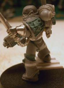 I started this project when I was reading a lot about and seeing a lot of pictures of Enlarged / True-Scale Marines. This project (still going on) was a new motivation drive for me to get more involved with the Dark Angels again and involves an entire true-scale Marine force. Starting a whole new army would allow me to more or less dump my old army, or at least not have to look at all my first-ever paintjobs for awhile. Basically a lot of thought went into this project including some ideas for fluff to back up army composition etc. (this includes a squad of "Knights of the Order"). It is a Dark Angels army and therefore of course has to include certain real Dark Angelique choices, units that are unique to the Dark Angels. The very first one that comes to mind here is off course the Interrogator-Chaplain. There are a few characteristics that I wanted to include. First off all he had to be true-scale, he had to "look" like a Dark Angel and with some of the fluff idea's I made for him I wanted him to look a bit old & wise therefore not charging into the combat himself but rather give the idea as if he was commanding the troops around him. These characteristics were also a motivation for the wargear and armoury choices, a Storm Bolter & Bionics to present WYSIWYG rules, and also a few other pieces that CAN represent certain pieces of wargear. |