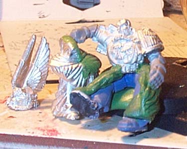 Step 1: I began firstly by hacking to pieces Azrael and the Watcher, after all the little feller wouldn't fit in the back carrying the helm for a start. As I cut them up with my jeweler's saws I took great care to keep the cuts to a minimum, and to try and minimize the damage to the parts. By doing this I was able to leave the Watcher in reasonable shape after removing the Helmet, and then using green stuff putty I crafted a new left shoulder for him, trying to keep the lines similar to the rest of the model.