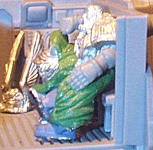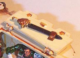 I had a half completed BAAL predator on my desk, so when it came to altering Azrael I was able to use the BAAL to guide me in customizing him so that he would fit in the back. I cut his legs off just below the waist and then cut off his right arm at the elbow. I went to the bitz box, found myself a pair of old legs, by cutting away the waist section I altered the angle so that Azrael could sit down, then I had to cut off both feet and reposition them so that one would be flat on the ground the other in the air (I tried for a realistically relaxed pose). I then set to work sculpting his robes with green stuff, which was surprisingly easy. |