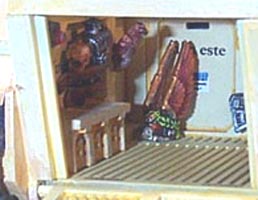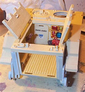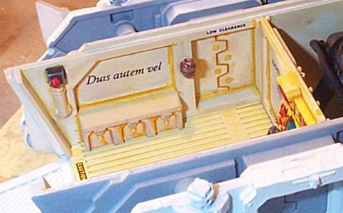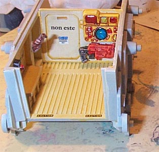 Each panel is shaded top to bottom and front to back, so that the interior by the driver's compartment door and under the console is darker (bleached bone and some chestnut ink) compared to the rear outer deck (white with bleached bone). I tried to re-create the actual lighting effects that you would find in a full size model. I painted all the interior panels first then attached the two sides and partially painted them. Then I fitted some wiring, radar screens and piping to the driver's area, and positioned the driver's seat. |