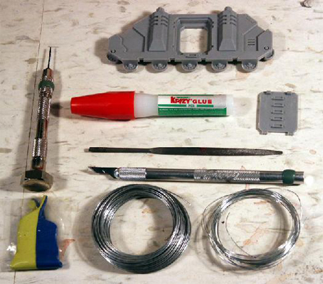 Pin vice (this will get A LOT of use) Wire (two gages and matching drill bits) Knife File 1 Rhino (obviously) Pliers (not shown)