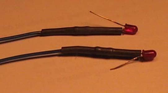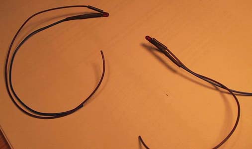 Trim the component-legs on the resistors, to a minimum (about 5mm is usually enough). Trim the component-legs on the LED's, but keep the proportions between the short and the long leg! For instance, trim one to about 8 or 9mm, and the other to 14 or 15mm. Solder the resistor to the short leg on the LED. Take a strip of wire, about 15cm long. Remove the insulation from one of the tips, about 5mm will do. Solder the strip of wire to the other leg on the resistor. Cut a fitting length of shrinkage tubing, and pull it over the end of the wires, so it covers the legs on both the resistor, and the LED leg that it's connected to. Heat the shrinkage tubing, using a lighter or a heat-gun, until it's fully contracted. Attach another length of wire, about 15-17cm in length, to the other leg of the LED. Preferably this is of another colour. Fit a small length of shrinkage tubing to the joint between LED and wire. Heat up. Repeat for the other side.