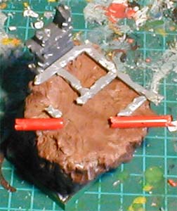 Tiles were done with cardboard (the unshiny kind, as this gets a nice stone look when drybrushed. The inside of a cereal packet is perfect), cut to shape and glued onto the frame. There will be shards of tiles littering around the place eventually, soe sticking out of the mud. (Stage 1H) |