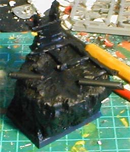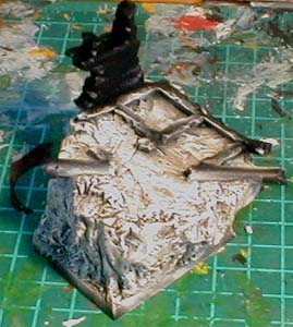 The next step was to start building up the detail on the top with the remains of a ruined building and lots of mud in order to asssemble the two spacemarines around it. The base takes shape. (Stage 1D) The pipe was made from a section of plastic tubing from an aircraft kit. I cut up pieces of sprue to make the grey squares which will be be the mounting for the floor tiles. The wall section is made from a piece cut off from one of GW's ruined building sections. Then came the black undercoating, (Stage 1E) followed by a heavy drybrush of Bleached Bone, and then a highlight of Skull White. (Stage 1F) You may wonder as to why I am dry brushing for a GD entry. Well, I think drybrushing is the best way to get a natural rock texture. It takes a bit of patience to do it right, but the end result is worth it. Finally, the pipes and floor support are painted. |