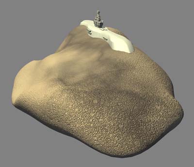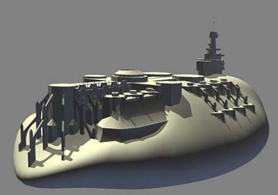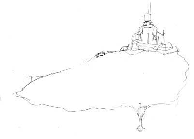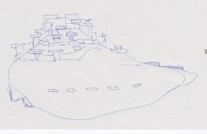 One evening I just scribbled the above three drawings (Drawings 1-3) as a rough guide to Radoslav. I envisaged a monastary with circumferential defensive walls which were a feature of the Fortresses of the "Order" on Caliban. The floating Rock would have a ragged under surface where it had broken off from the planet whith massive engines buried towards the back. There would also be defensive rings of batteries and torpedo launchers as well as docking bays for the strike cruisers of the chapter. I thought it would be nice to have a planet in the back ground and some strike cruisers in the foreground to provide some idea of the massive size of this floating asteroid.