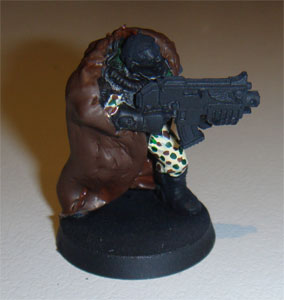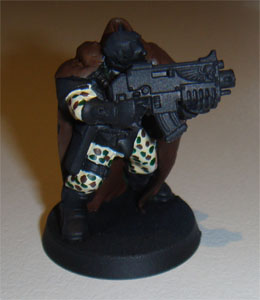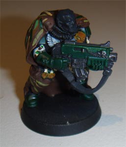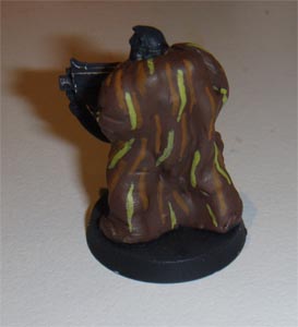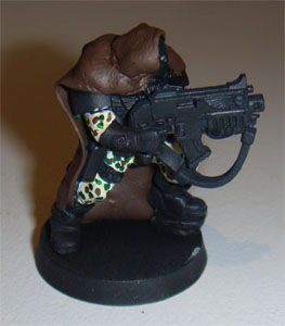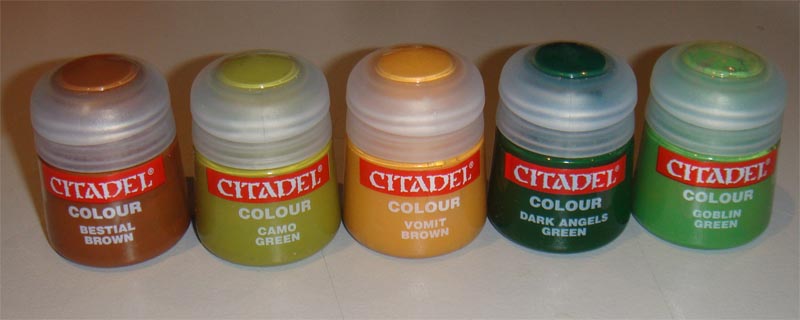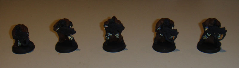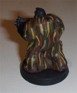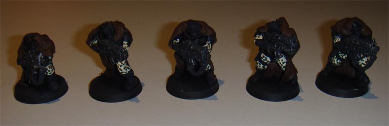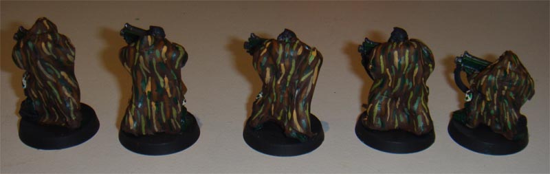 Finally commenced the camouflage patterns on the camo-cloaks. I couldn't make the lines as thin as I wanted. I really wanted to paint up a Gilly-Suit effect but my brushes aren't that fine! I settlesd on longer streaks aimed at bringing out the lines of the camo-cloaks. The last two colours I streaked in short lines. The colours used for the patterns are shown below.