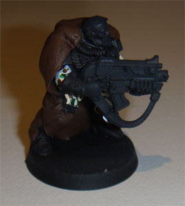 It was now time to add the Dark Angels green to the boots, gauntlets and gun stock. In addition the leathers received a layer of Bestial brown. The imperial aquillae were wwashed with Badab Black were all green surfaces.