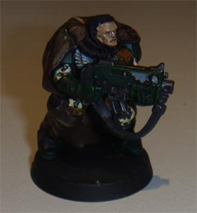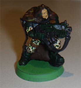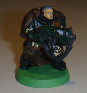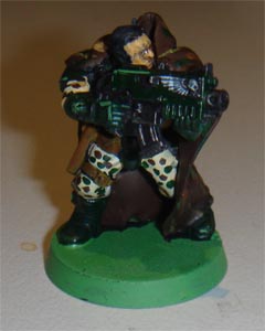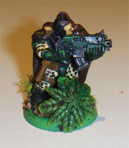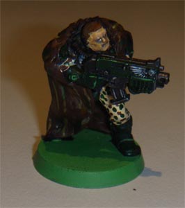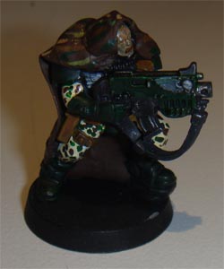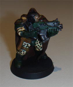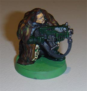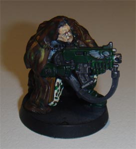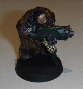 I am not quite happy the camo cloak and I think much thinner and far more numerous linear pattern would have been even better but I didn't have the necessary thinner brushes nor the time to do it. I also had to consider that this may form the standard for my scout army and so didn't want to put in far too much detail in order to reduce my own work load later.