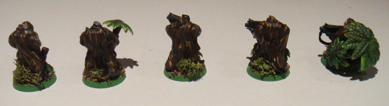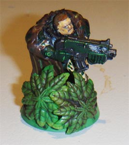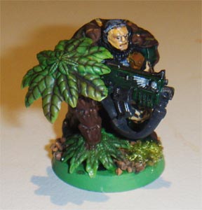 The final touches are added by completing the bases. I wanted to continue with the imagery of the scouts sudenly standing up out of cover and letting fly with their boltguns. So for the first time used the WH40K3 boxed set plastic trees. Some rock and grass flock and brushes were added in small quantities to add to the effect. A last wash of Ogryn Flesh Wash to the faces Devlan Mud to the tree leaves and I was done!