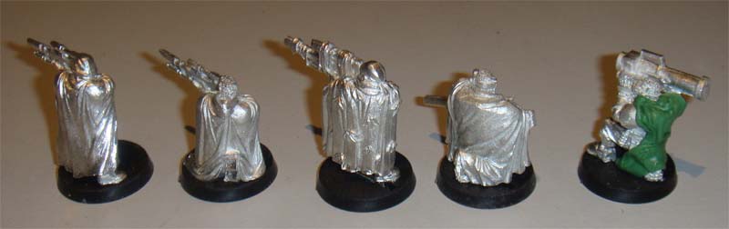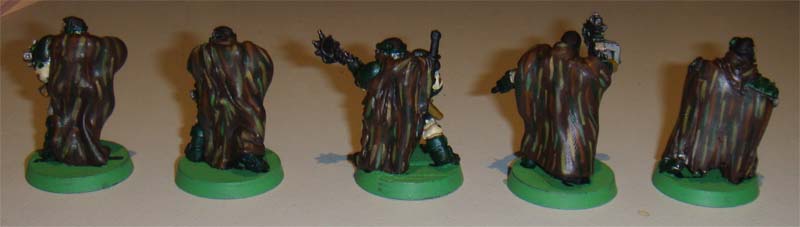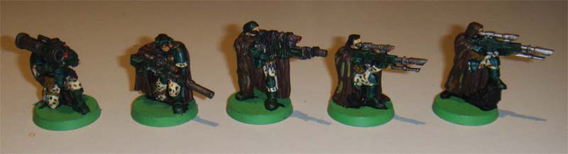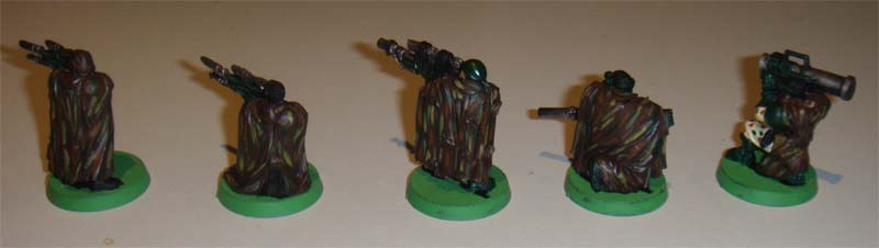 Keeping with my philosophy of trying to create each model in a unique pose I started work on my collected scout models that had been waiting for many years. This squad of snipers is made up of (from left to right) metal scout missile launcher, metal scout sniper, metal catachan sniper and two metal cadian snipers) The presence of their cloaks makes it easier to model as scouts while their build is about the same. I just added a greenstuff cloak for the missile launcher scout and groin armour to two of the Ig snipers.