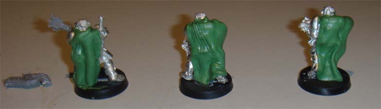 I think I am getting better with the greenstuff sculpting but I still can't get the kind of folds that the GW sculpters get, especially on the metal models. At the moment I am simply using a single piece of thinned out GS to create and wrap around the models. I might try separate sheets so that the folds can be created by layering, next time!